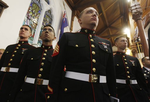 U.S. Marines stand to attention during a special service to commemorate the 10th anniversary of the Sept. 11 terrorist attacks, at a church in New Plymouth, New Zealand, Sunday, Sept. 11, 2011. The US team will play Ireland in their opening Rugby World Cup game later today. (AP Photo/Dita Alangkara)