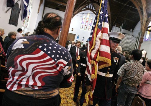 A member of the U.S. Marines carries their national flag past a man wearing a stars and stripes shirt during a special service to commemorate the 10th anniversary of the Sept. 11 terrorist attacks, at a church in New Plymouth, New Zealand, Sunday, Sept. 11, 2011. The US team will play Ireland in their opening Rugby World Cup game later today. (AP Photo/Dita Alangkara)
