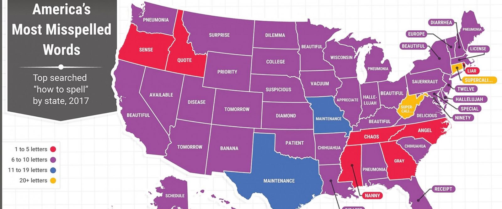 Just in time for the 90th Scripps National Spelling Bee — which started on May 28 and runs through June 4 — Google Trends has released a map of "America's most misspelled words."