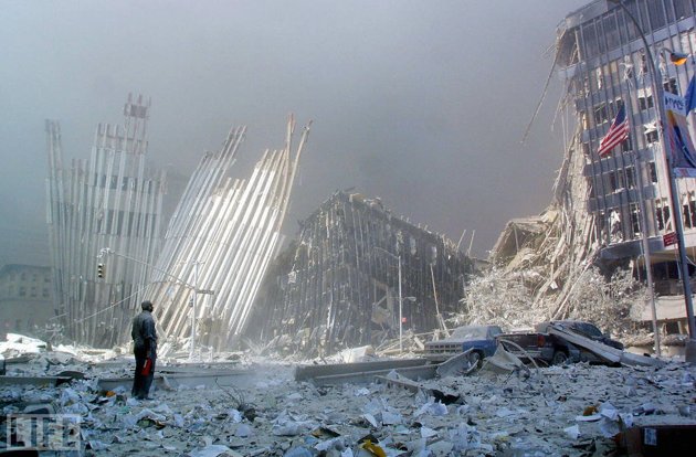 15. Like a scene from an uneasy dream, Doug Kanter's picture of a man standing amid the seemingly endless World Trade Center rubble, calling out for survivors, brings to mind the sense so many of us shared on 9/11 and in the days and weeks after: What, in the face of such annihilation (歼灭, 灭绝), can one person do? "I was on autopilot after the first tower fell," Kanter told LIFE.com. After briefly taking shelter, he stepped outside into streets that "were pretty much deserted, and that's when the person in the picture emerged. He looked like he might be a maintenance worker, had a fire extinguisher in his hand, and was calling out to see if anyone could hear him, saying they should make noise, and people would come and help." Not long after Kanter took this photo, a police office hustled (推) him away from the spot. Minutes later, the second tower collapsed.